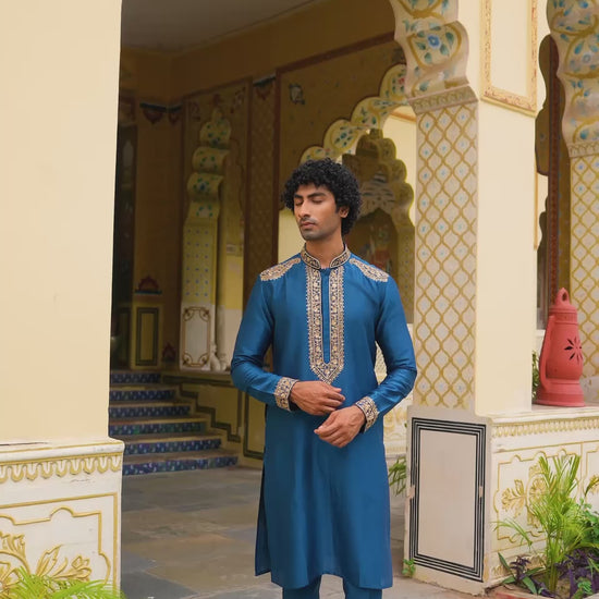This 2 piece kurta set features tikki and zardosi embroidery on the neckline, shoulder and sleeves of the kurta.