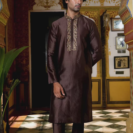 Ahista Brown Zardosi Embroidered Neckline Kurta Set