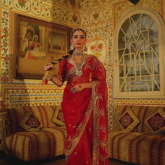 This saree set features heavy zardosi, aari dori and tikki embroidery all over the saree.The blouse is enhanced with heavy embroidery on the sleeves with bustis spread all over.