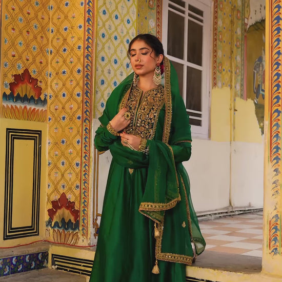 This 4 piece kalidar set features a heavily embroidered neckline with zardosi and tikki work. It is paired with staright pants and a heavily embroidered dupatta.