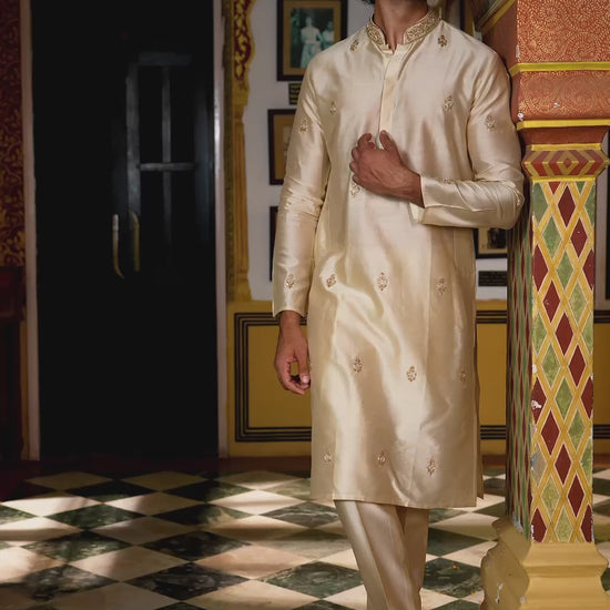This 2 piece kurta set features zardosi embroidery on the collar and butis spread all over the kurta.