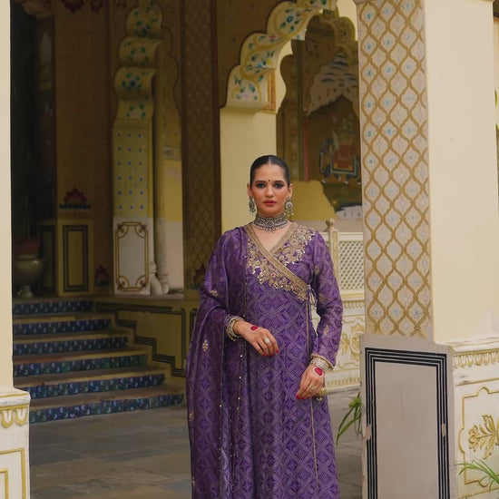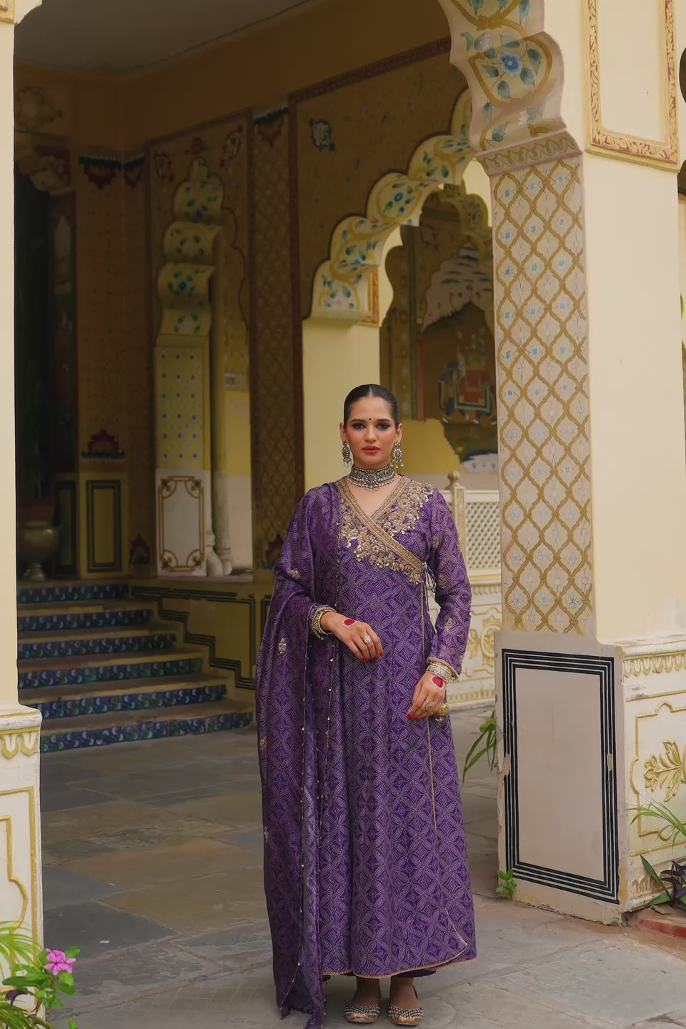 This 4 piece angrakha kalidar set features heavy zardosi, tikki and resham embroidery on the neckline and sleeves of the kurta. It is paired with plain pants and a printed embroidered dupatta.