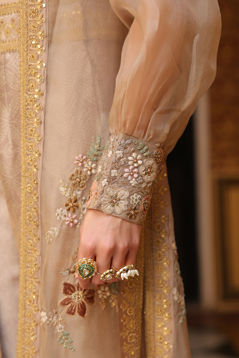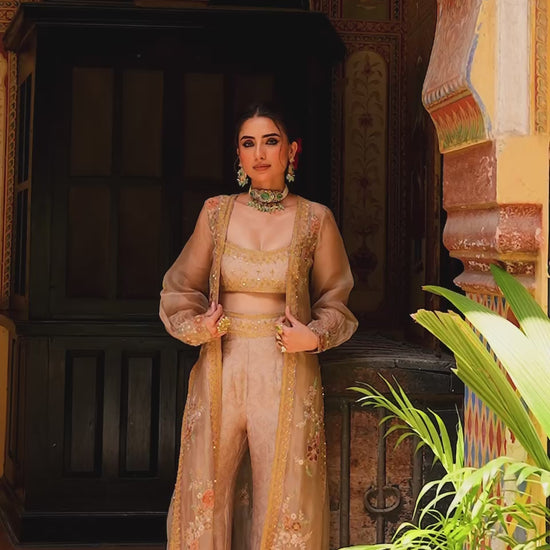 This 3 piece cape set features delicate aari embroidery enhanced with tikki and zardosi work on the cape. It is paired with a printed embroidered bustier and flared pants.