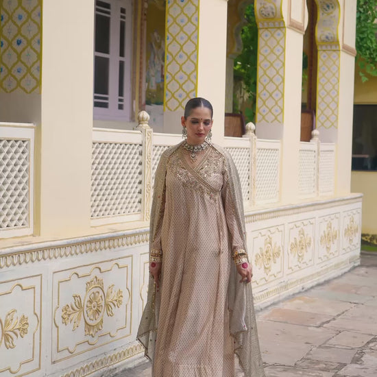 This 4 piece angrakha kalidar set features heavy zardosi, tikki and resham embroidery on the neckline and sleeves of the kurta. It is paired with plain pants and a printed embroidered dupatta.