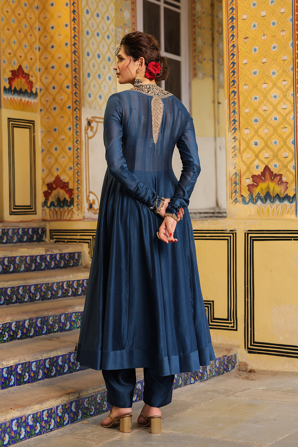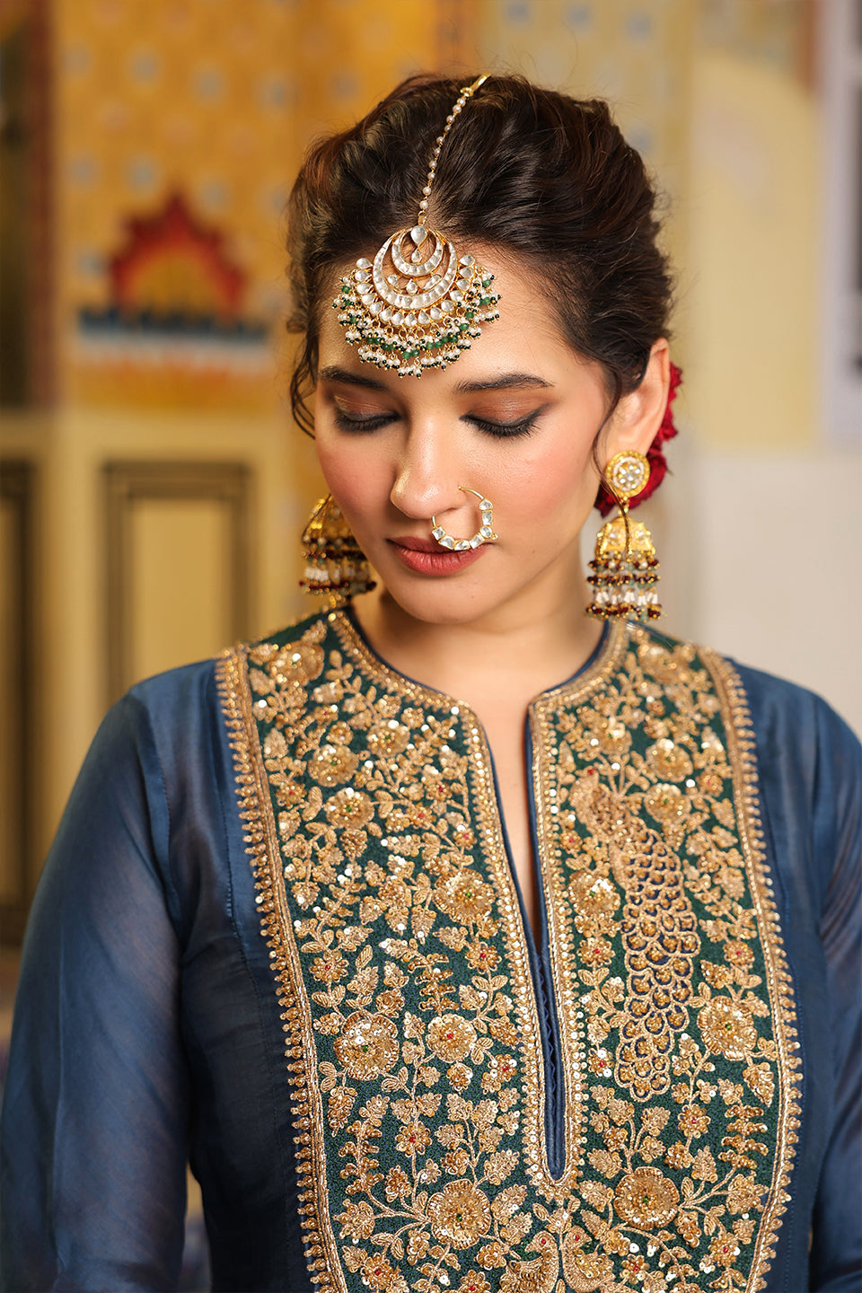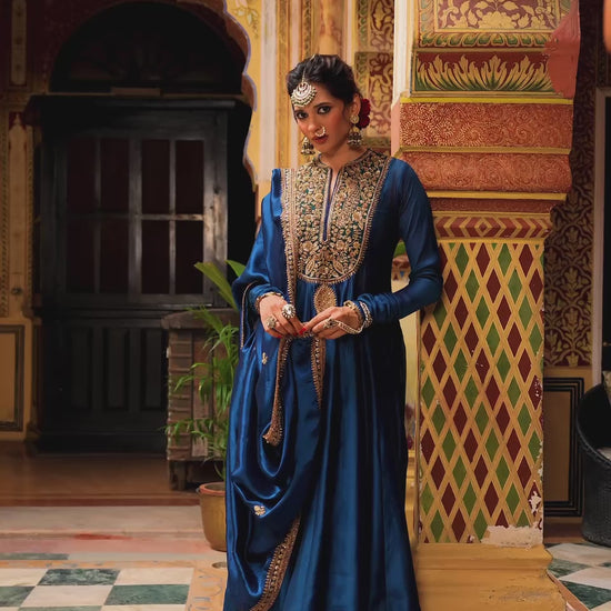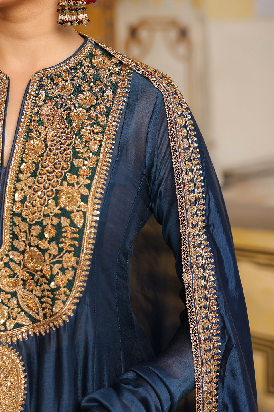 This 4 piece kalidar set features a heavily embroidered neckline with zardosi and tikki work. It is paired with staright pants and a heavily embroidered dupatta.