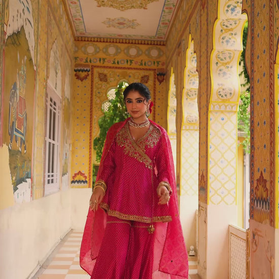 This 3 piece angrakha style sharara set features heavy zardosi, tikki and resham embroidery on the neckline, sleeves and hem of the kurta and sharara. It is paired with a printed embroidered dupatta.
