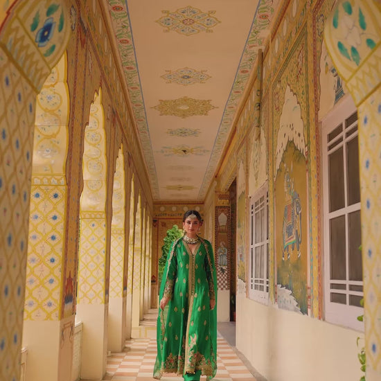 This 3 piece kalidar set features heavy embroidery at the hem and sleeves of the kalidar with butis spread all over. It is paired with straight pants and a heavily embroidered dupatta.