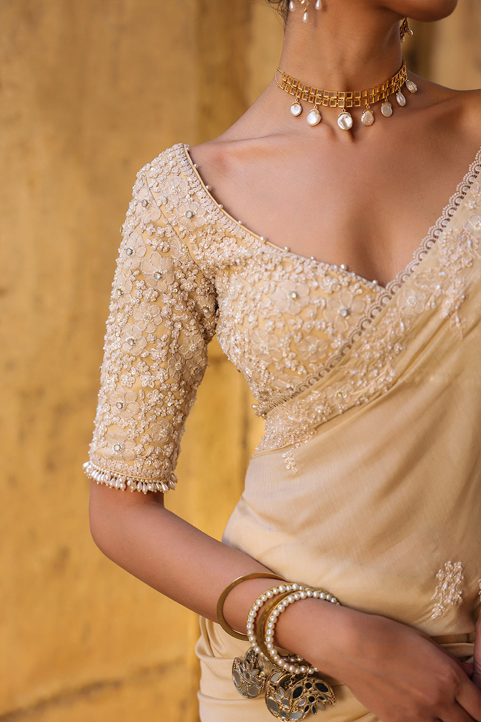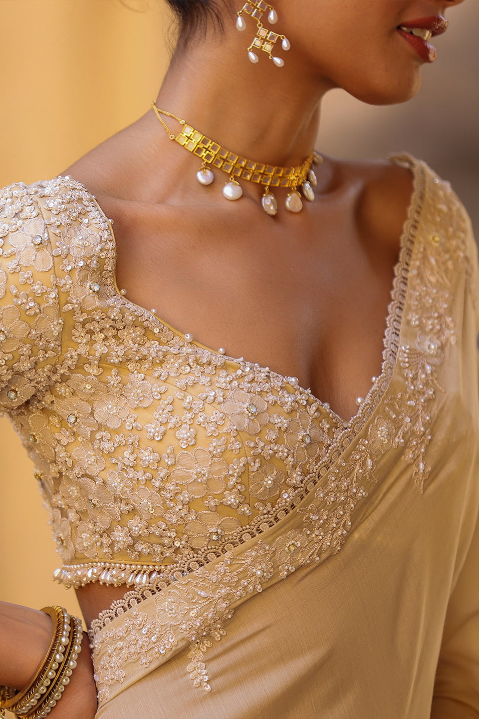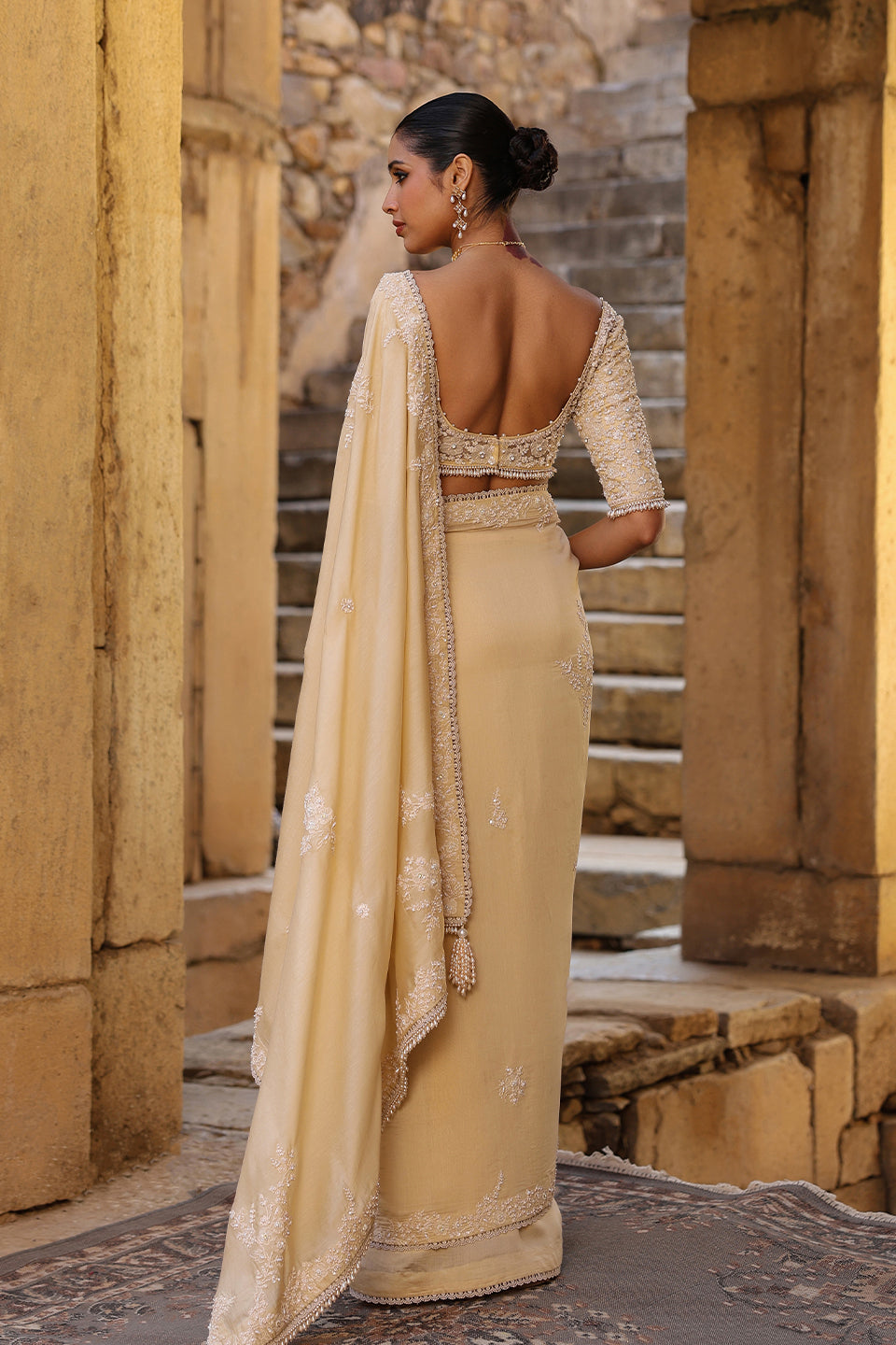 This saree set features heavy applique,resham and pearl embroidered border and butis speard all over the saree. It is paired with a heavy embroidered blouse with pearl hangings at the hem and sleeves.