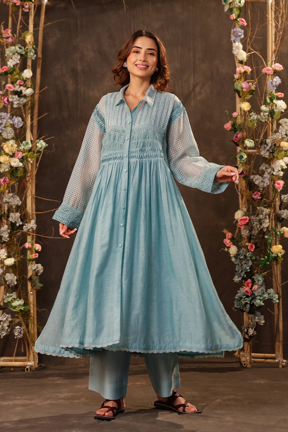 This kurta set features pintuck and lace detailing on the yoke and sleeves of the kurta. It comes with a collared neckline with front button opening. It is paired with straight pants.